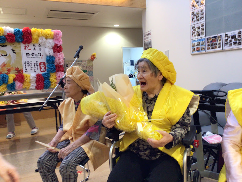 3名のお祝いをした後、利用者様、職員で千昌夫の「北国の春」に合わせて体操をしました。